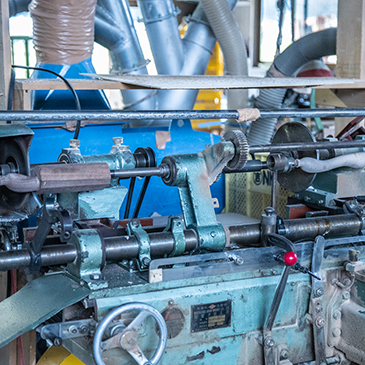 脚物家具(椅子やテーブルなど)の製造が盛んな飛騨地方独特の機械です。材を回転させながら、かつ並んだ数枚の刃も回転している所に慎重に当て、切削していきます。様々な形に対応するため、自社で刃を成型・研磨しています。